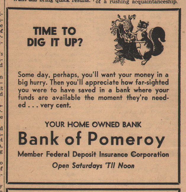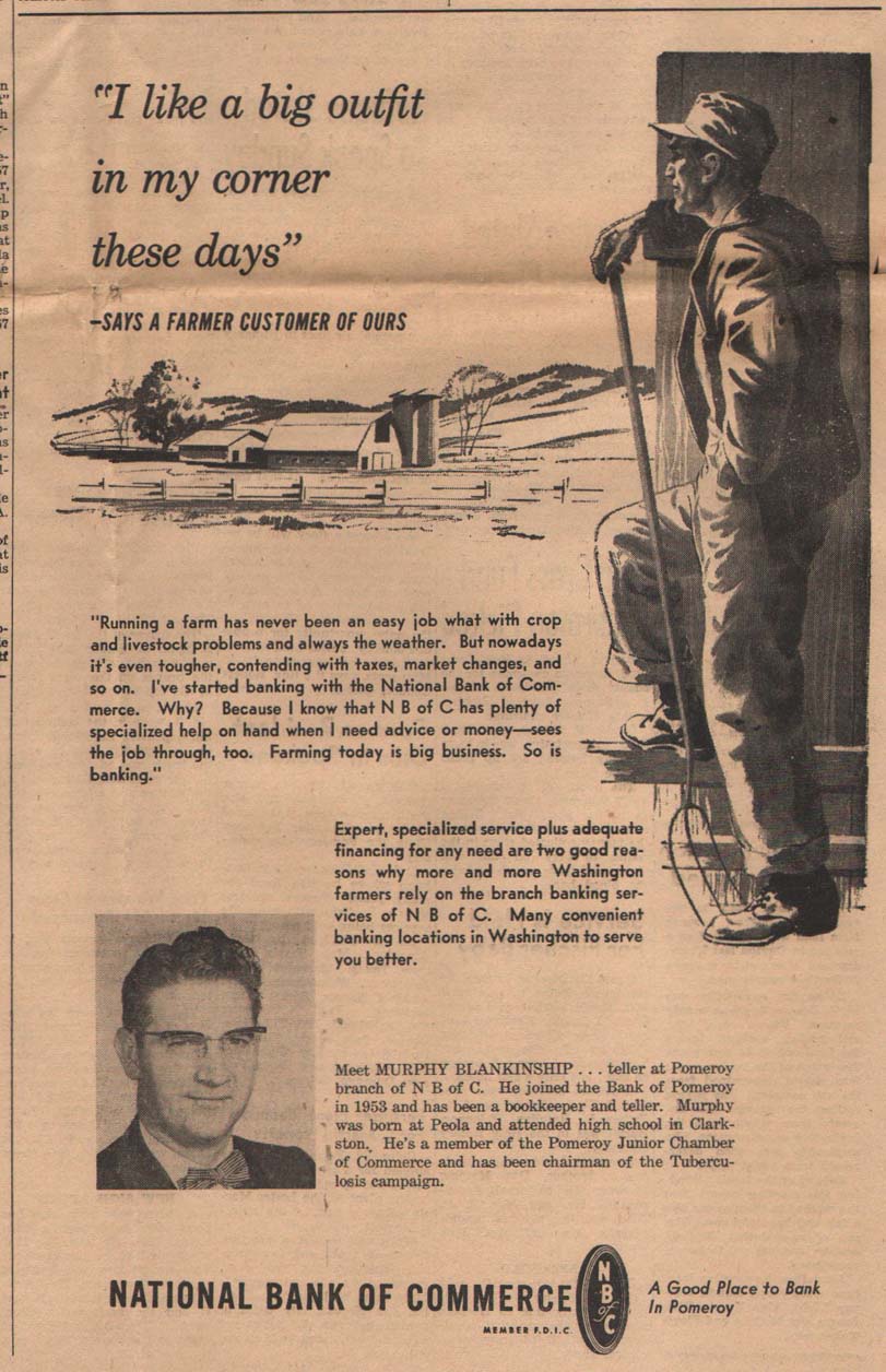 One of the first advertisements (2/28/57) from the Pomeroy branch of the National Bank of Commerce features Pomeroy's Murphy Blankinship who was born in Peola.
