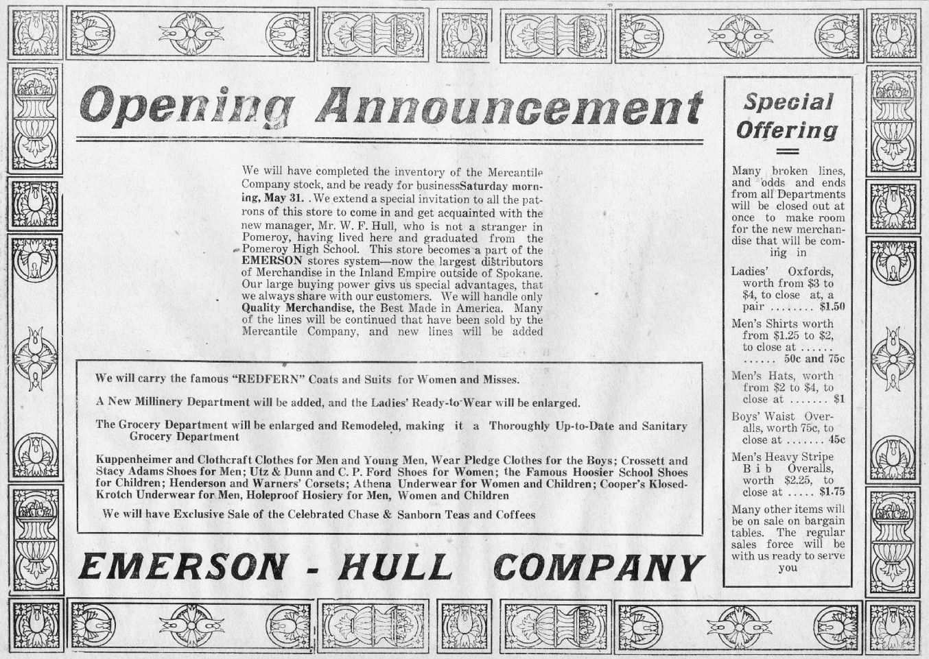 The previous advertisement was the good-bye from The Mercantile Company. The following week's newspaper (still May, 1919), was the "Hello" from Emerson and Hull.