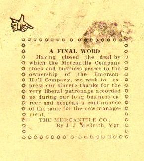 From May, 1919, the official word on the sale of The Mercantile Company to Mssrs. Emerson and Hull. This was a 'strange' advertisement, the ad was two columns wide by half a page tall. Mostly blank except for this 2" by 2" block of text.