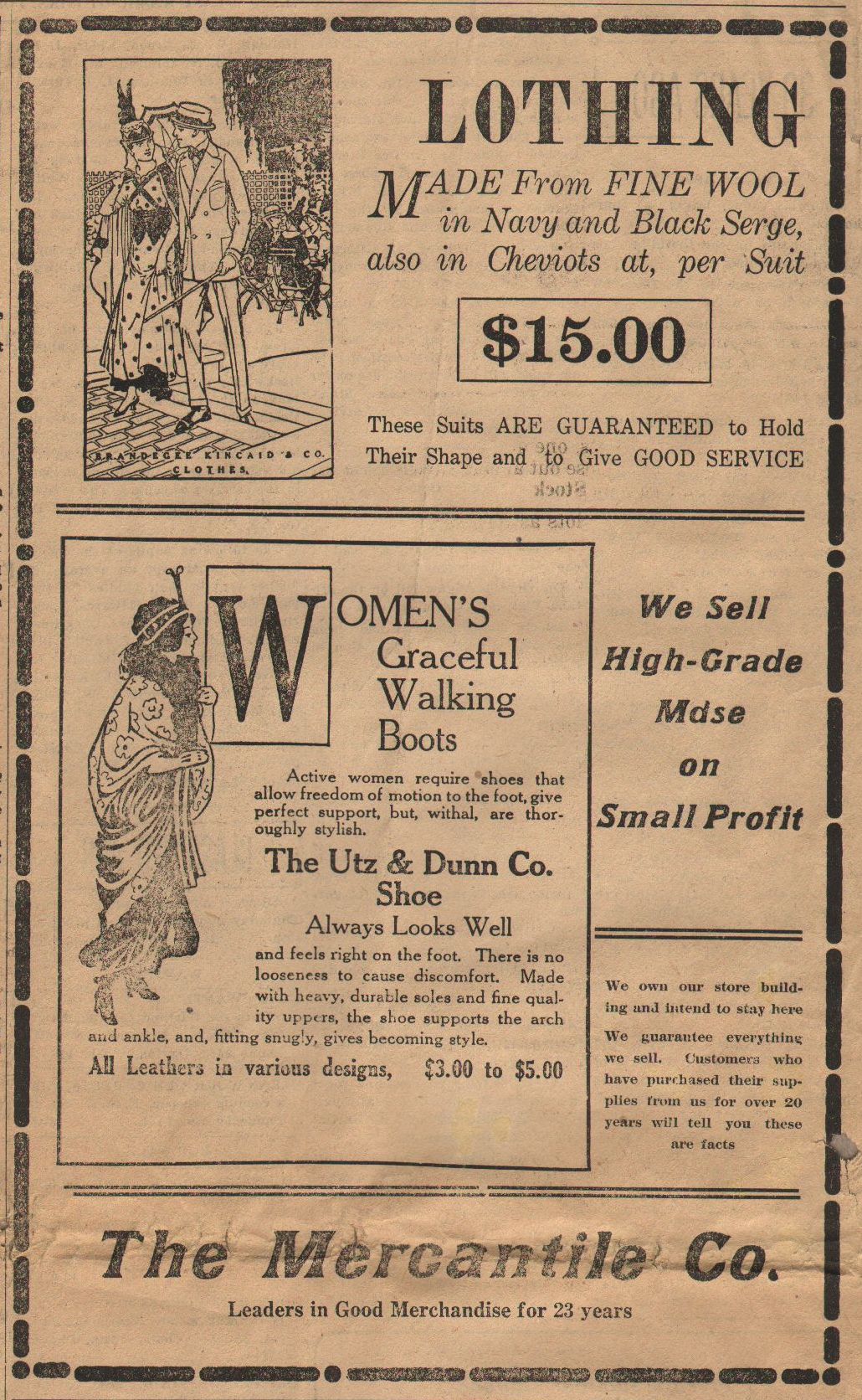 From sometime in 1915, you could purchase "Lothing" and Women's boots from the company that sells "High-Grade Mdse on Small Profit."