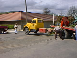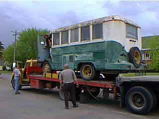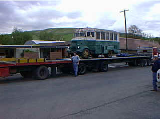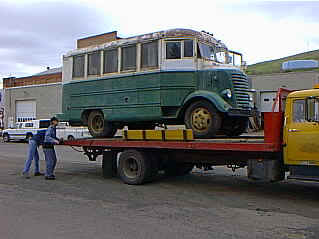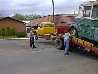 Doug Lueck of Doug's Towing, (Pomeroy, Washington) checks the alignment as the Howard Hughes bus is moved from the flatbed trailer to Doug's flatbed tow truck. |