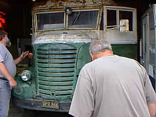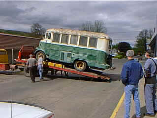 The new owner of the Howard Hughes bus is checking out the alignment of the tow truck as the bus is slowly backed down to the pavement. |