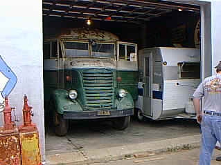 The old and the "new." As the Howard Hughes bus is backed into the Lost Highway Museum, it temporarily sits next to a 1960's era "Little Loafer" travel trailer. |