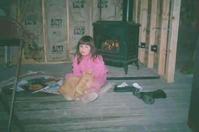 Oliver and Brittany Ann snuggle up in front of the fireplace during the winter of 1999. | |