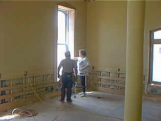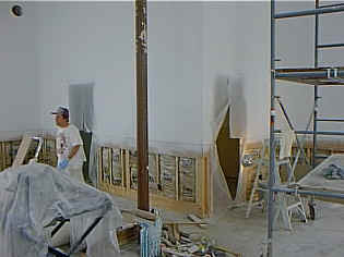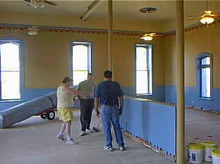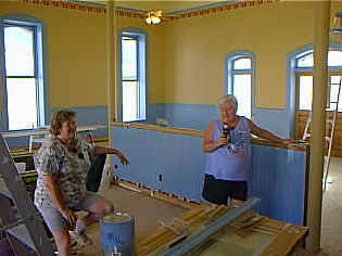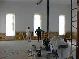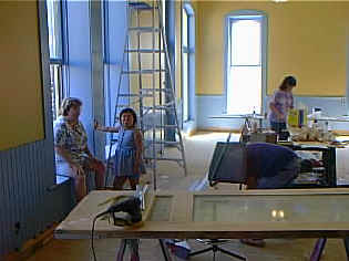 We skip a few days and some pictures as we see the beadboard (wainscoting) in place and painted. Deborah Hancock (in far view) and Keith Wilber handled painting the beadboard. The beadboard was all "salvaged" from this room (in the top picture, you can see it). Beverly's dad, Bruce, came up with a way to strip almost all of the old paint off each piece of tongued and grooved beadboard before parts of it were hand stripped. |