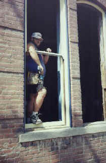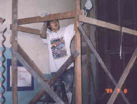 Robert Crawford climbs the scaffolding yet again to help strip lath and plaster from the future office's walls. | |