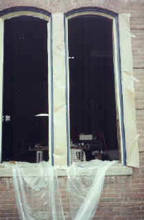 Two of the 7th Street window frames taped, primed, painted, and ready to install the window. | |